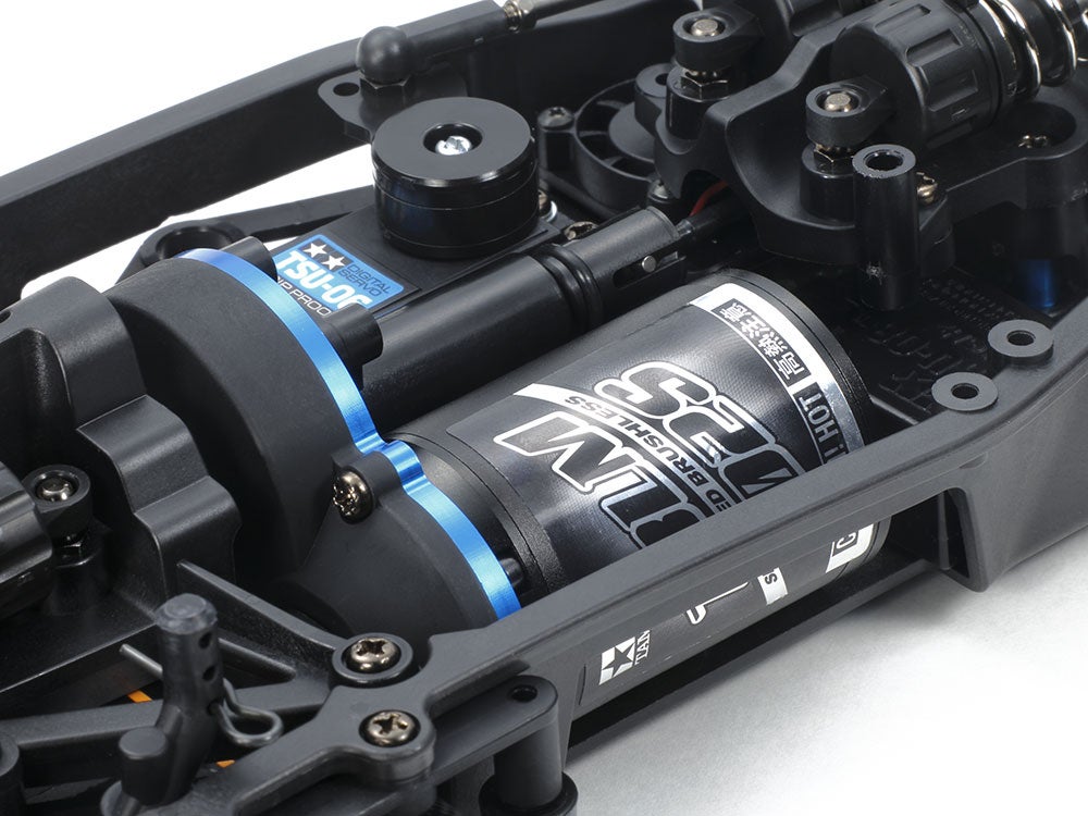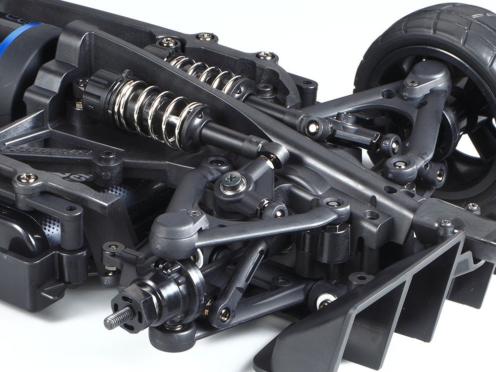 Ce châssis monocoque en composite durable offre des 4 roues motrices entraînées par un moteur central via des arbres de transmission avant et arrière, avec des différentiels à engrenages remplis d'huile. La suspension à double triangulation indépendante aux 4 roues utilise des bras longs, ainsi que des réglages intérieurs à l'avant et à l'arrière avec des amortisseurs à huile actionnés par des tiges de poussée et des culbuteurs pour permettre l'utilisation de carrosseries à profil bas. La largeur des entretoises permet de modifier facilement les réglages de carrossage, de patinage et d'angle de pincement. Les deux bras de suspension et les montants sont identiques à gauche, à droite, à l'avant et à l'arrière, pour un travail plus efficace dans les stands.